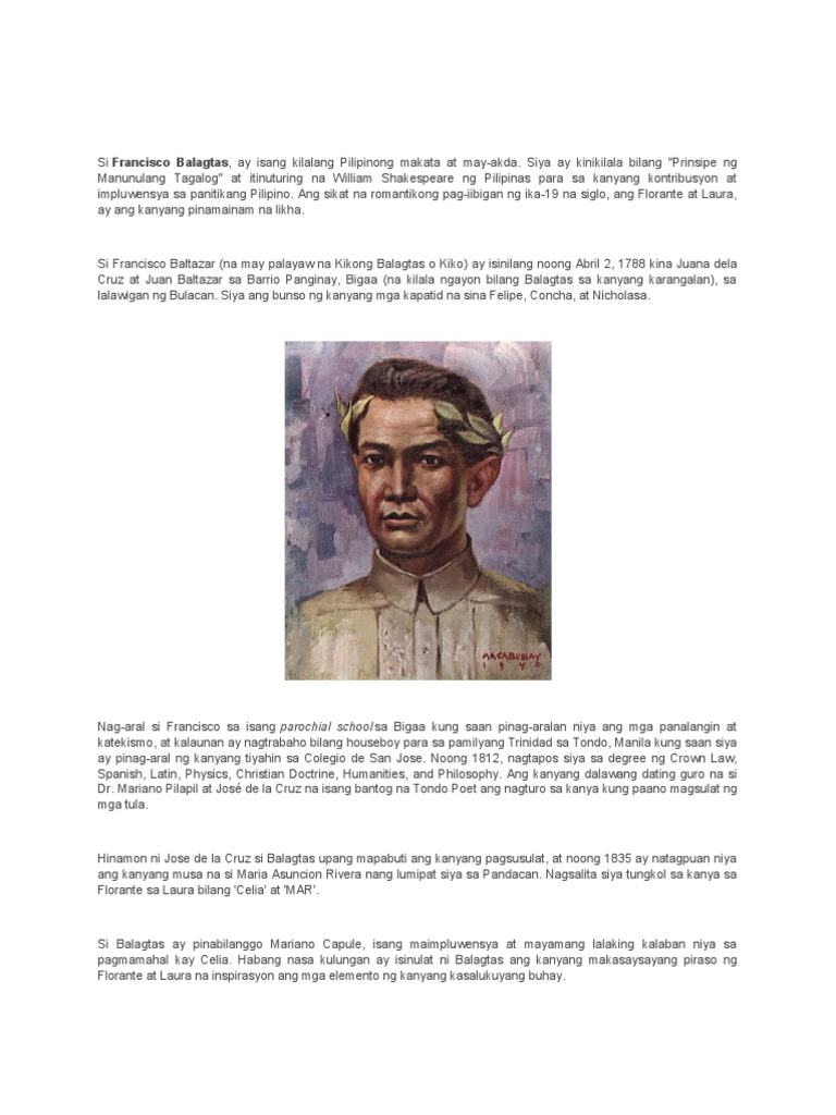Hindi siya nakapag-aral ngunit sa sariling pagsisikap ay natuto ng Katon at Cartilla Doctrina Cristiana Pilosopiya at Teolohiya. Nag-aral si Francisco sa. Ang Unang Pagdadalamhati ng Bayani.
